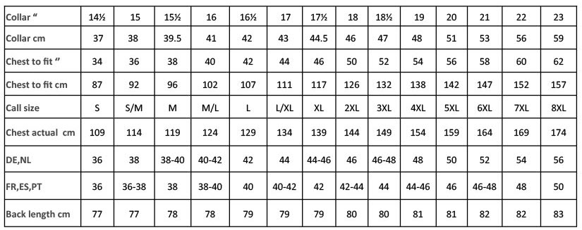 | Chest (to fit) | 34 | 36 | 38 | 40 | 42 | 44 | 46 | 48 | 50 | 52 | 54 | 58 | 62 | 66 |