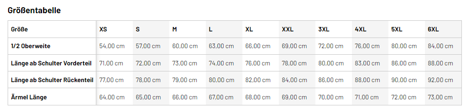 Größen: XS – S – M – L – XL – XXL – 3XL – 4XL – 5XL – 6XL