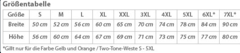 Größen: S – M – L – XL – XXL – 3XL – 4XL – 5XL – 6XL* – 7XL** in ausgewählten Farben erhältlich